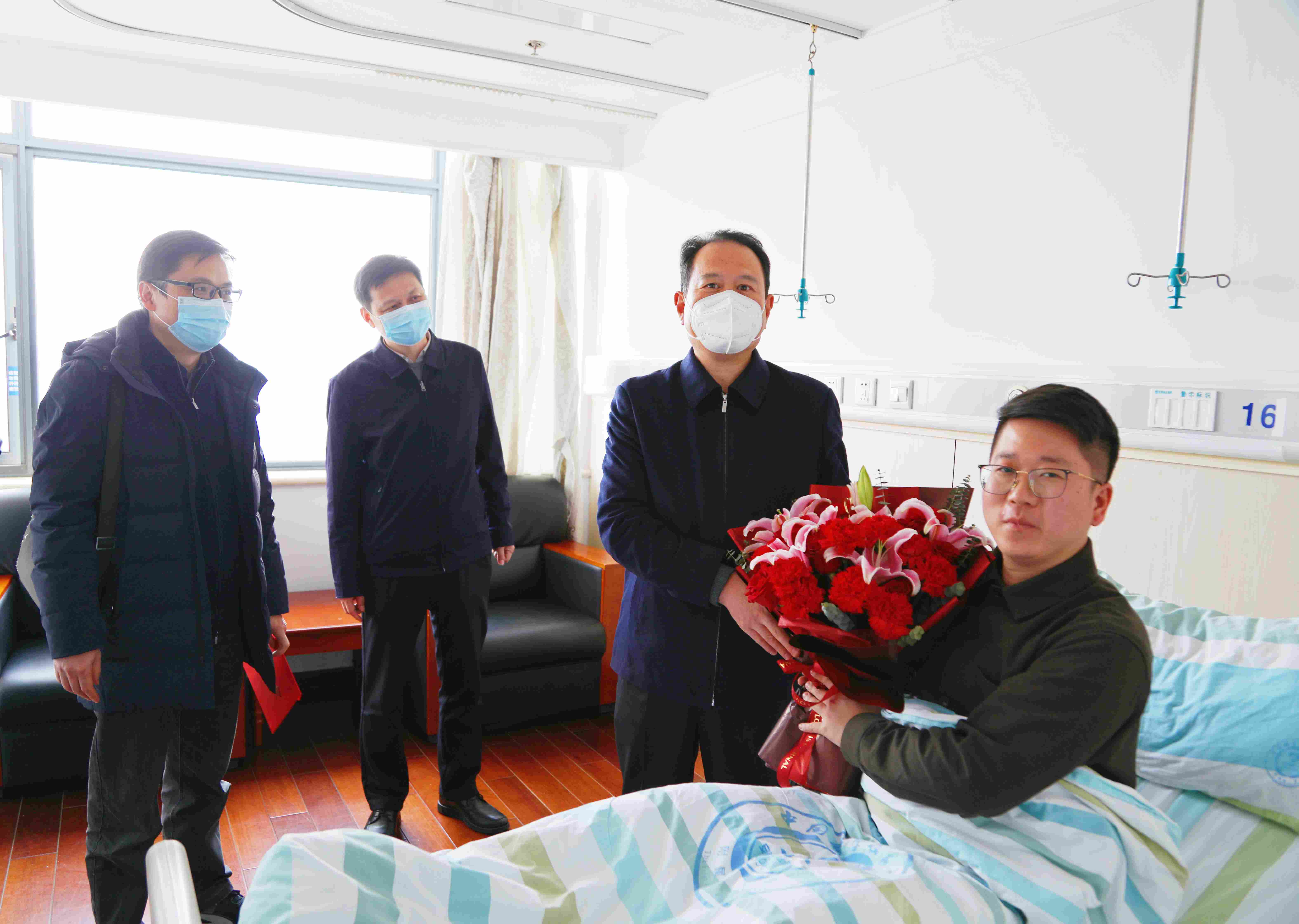近日,交控集團黨委群眾工作部部長、工會副主席操太林來到省立醫(yī)院,看望慰問交控建工集團職工、造血干細胞捐獻者楊運凱,送去鮮花和慰問品。交控建工集團黨委副書記、總經理陳欣,黨委副書記、工會主席朱波參加慰問。
